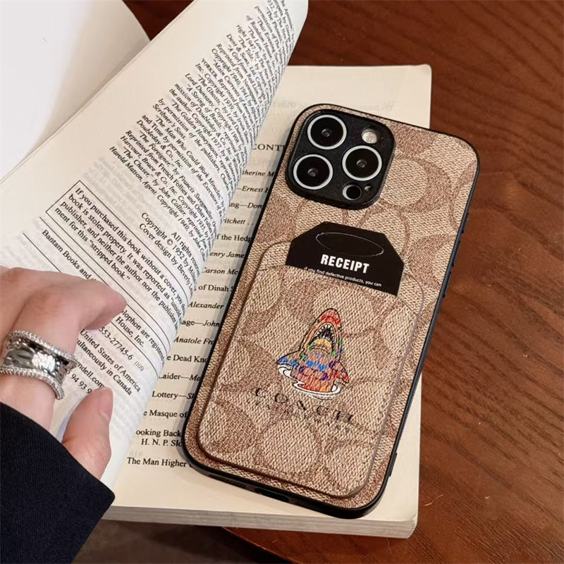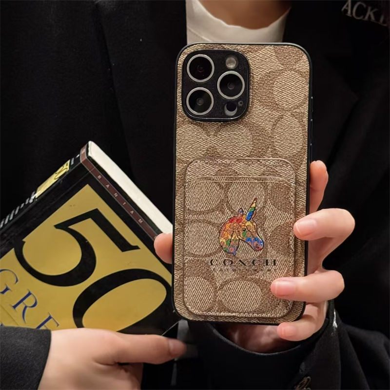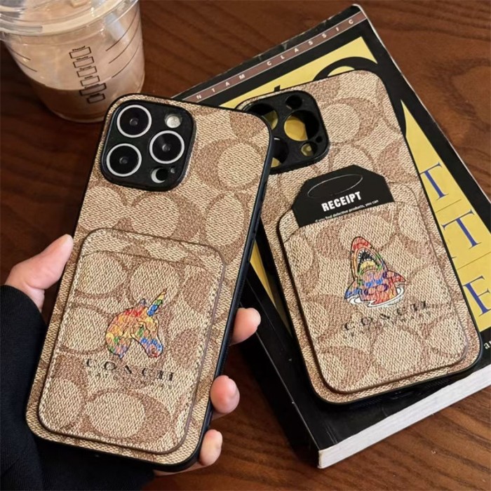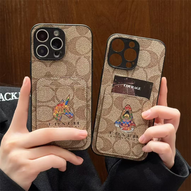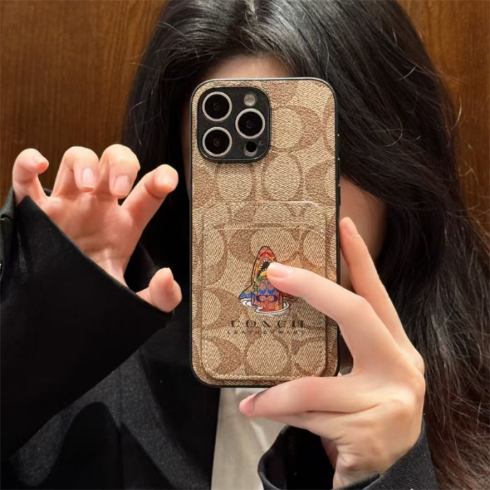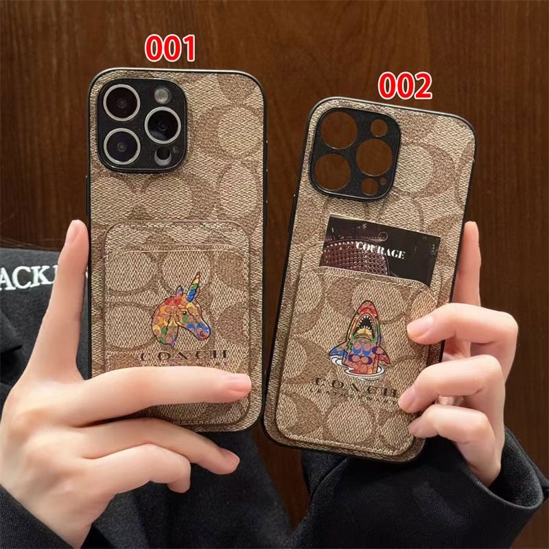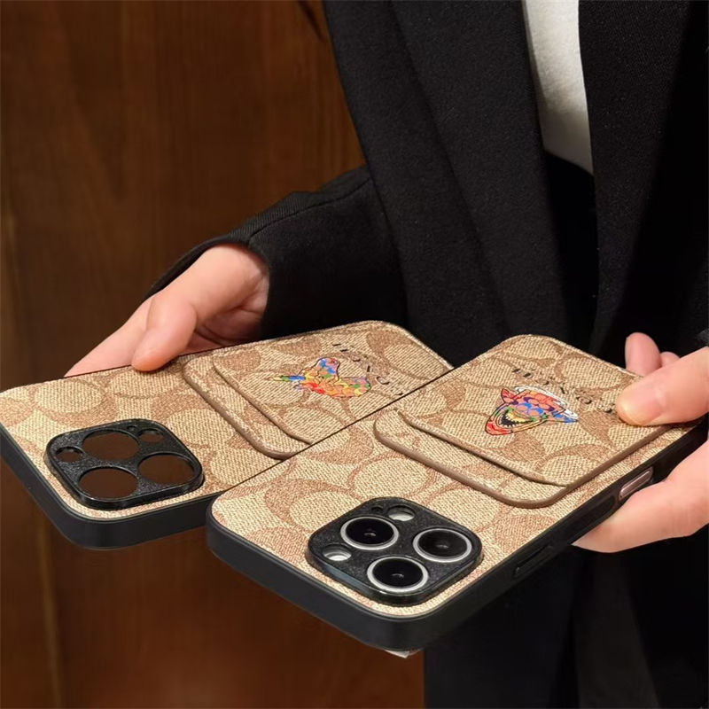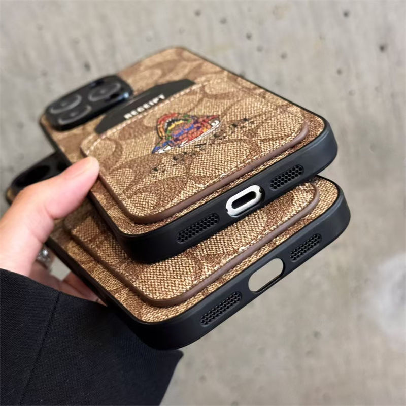 Coach 風モノグラムキャラクターカードポケット付き iPhone17 15 13 スマホケース 個性的なデザインと高級感を融合したファッションアイテム